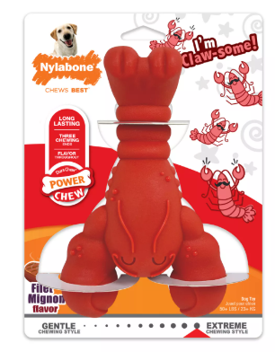 The Nylabone Power Chew Lobster Dog Toy is a fun and durable chew toy that adds a touch of whimsy to your dog’s collection. Designed with a lobster-inspired shape, it features three easy-to-hold chewing ends, perfect for dogs to grip and chew from claw to tail. The textured design helps clean teeth while reducing plaque and tartar as dogs chew. Made from Nylabone’s toughest material, this toy is built to withstand aggressive chewers, and the filet mignon flavor throughout makes it extra satisfying. Perfect for dogs over 50 pounds, it promotes healthy, non-destructive chewing habits and brings excitement to playtime!